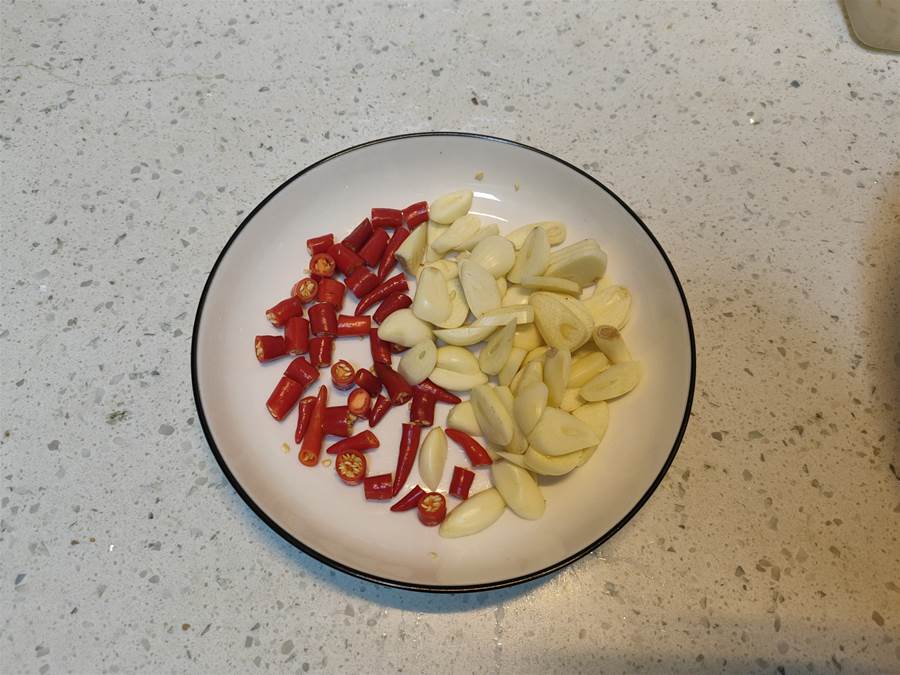 2、把大蒜切成蒜片,小米辣切成小段備用。